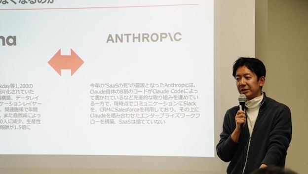 モデレーターを務めた佐野は、まず冒頭に米国を中心としたSaaS関連株価の2026年初来からの低調なパフォーマンスに触れ、”SaaS黙示録”議論の論点整理を行った。その上で、競争優位の源泉は個々のプロダクト機能のみならず、「AIネイティブな組織をどう作れるか」にあると指摘。人とAIの役割をどう再設計し、経営者自身がどこまでAIに向き合えるか。その実践の深度こそが、模倣困難なMOATになり得るという視点でセッションをリードする。